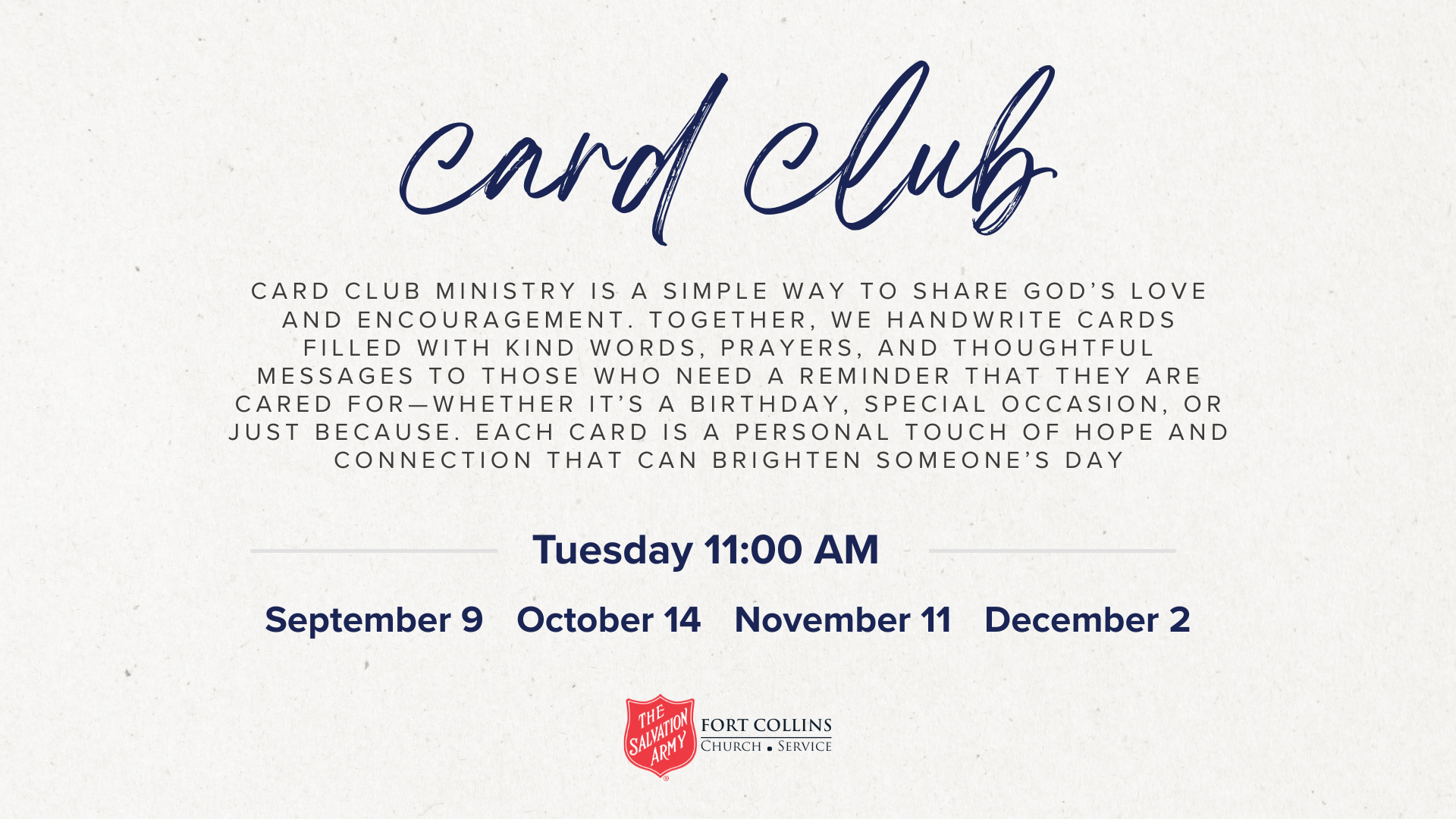 Card Club Ministry is a simple way to share God’s love and encouragement. Together, we handwrite cards filled with kind words, prayers, and thoughtful messages to those who need a reminder that they are cared for—whether it’s a birthday, special occasion, or just because. Each card is a personal touch of hope and connection that can brighten someone’s day.