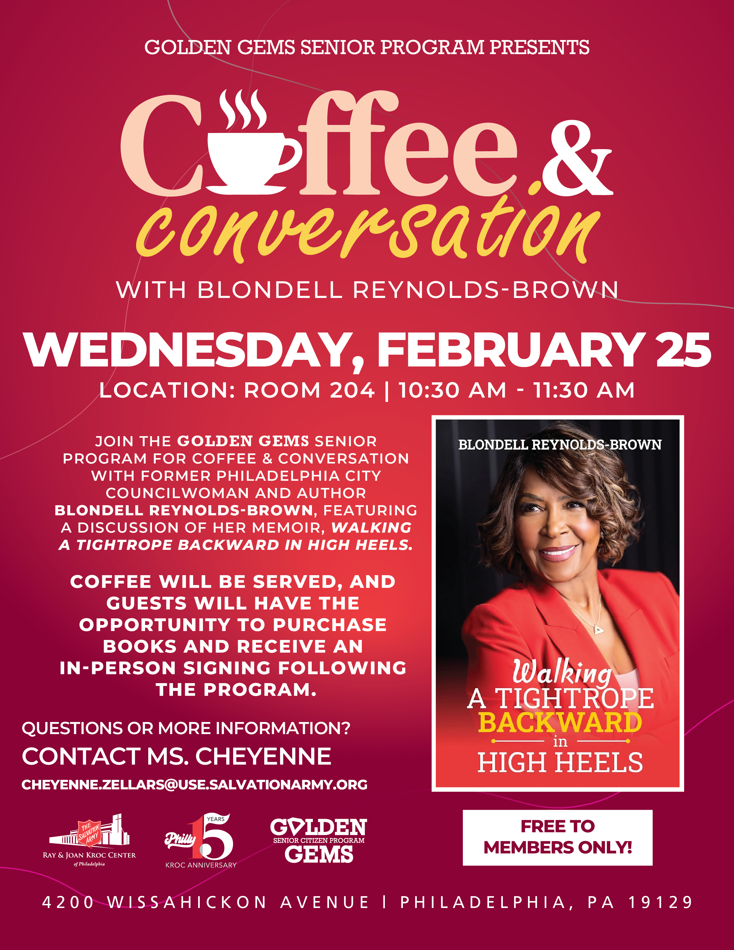 You are warmly invited to join the Golden Gems Senior Program for a special Coffee & Conversation event featuring Blondell Reynolds‑Brown, former Philadelphia City Councilmember and author of the memoir Walking a Tightrope Backward in High Heels.