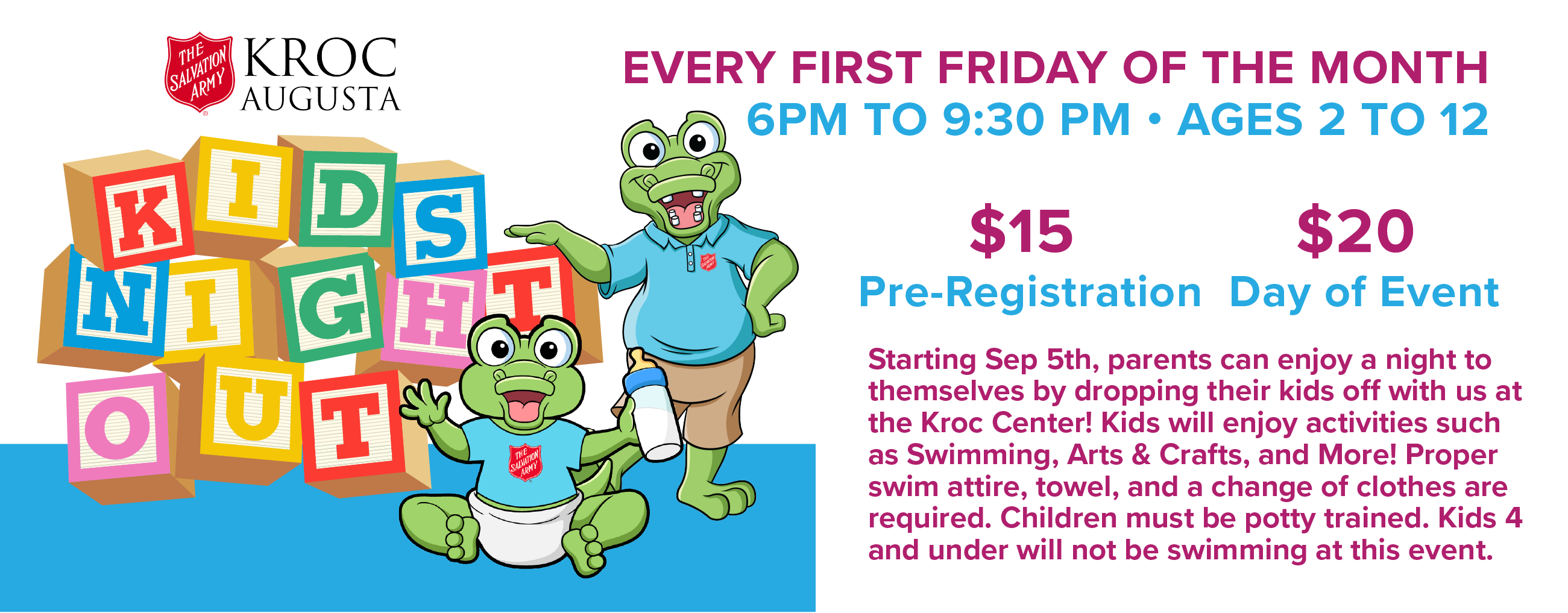 Parents can enjoy a night to themselves by dropping their children, age 2-12, off at the Kroc Center from 6PM-9:30PM, the first Fridays of most months! Children will enjoy activities such as swimming, games, arts and crafts, and more. Proper swim attire, towel, and a change of clothes are required. Children must be potty trained. (Children 4 and under will not swim.)