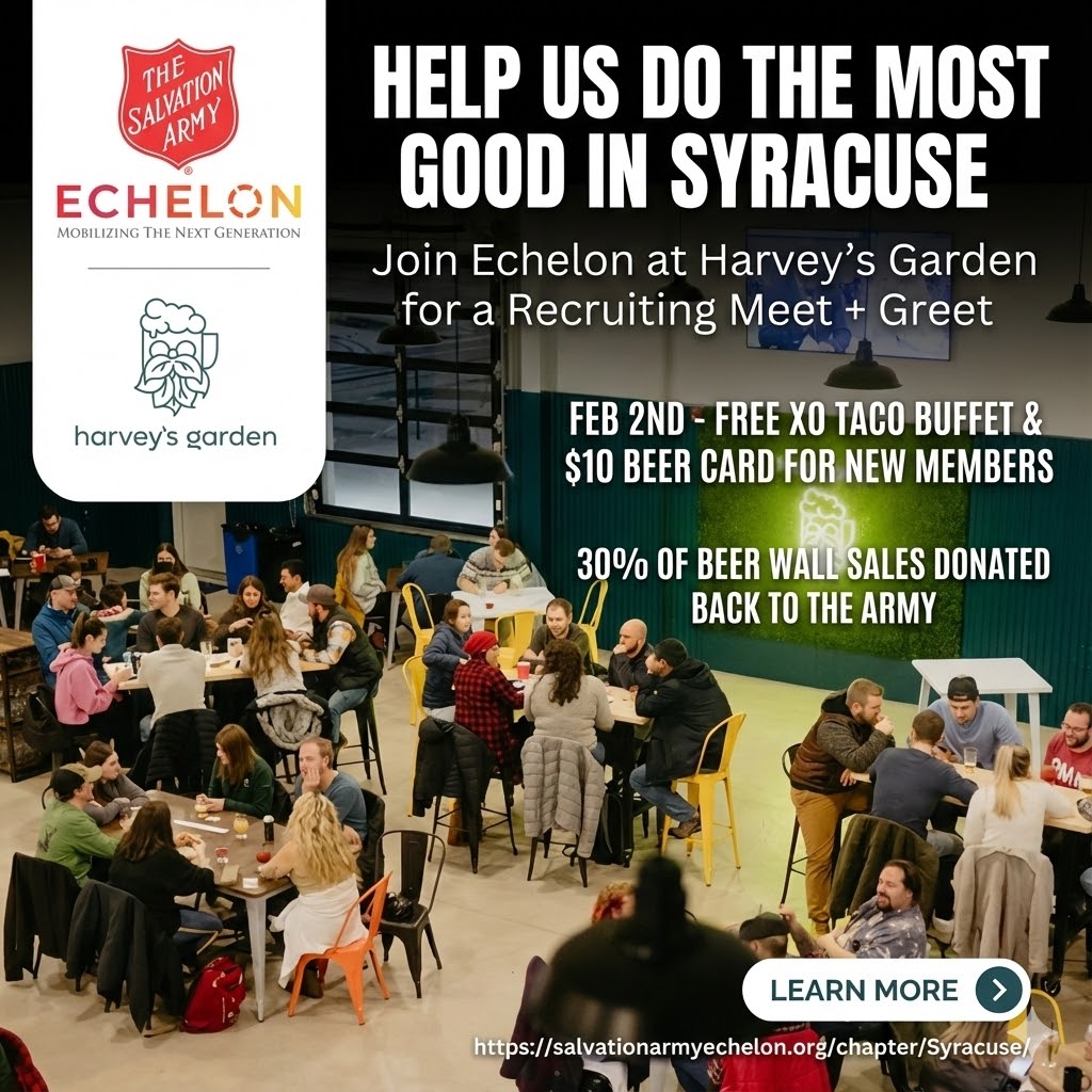 On February 2nd, join Echelon at Harvey’s Garden for a recruiting meet + greet. We are a community of leaders dedicated to supporting The Salvation Army.