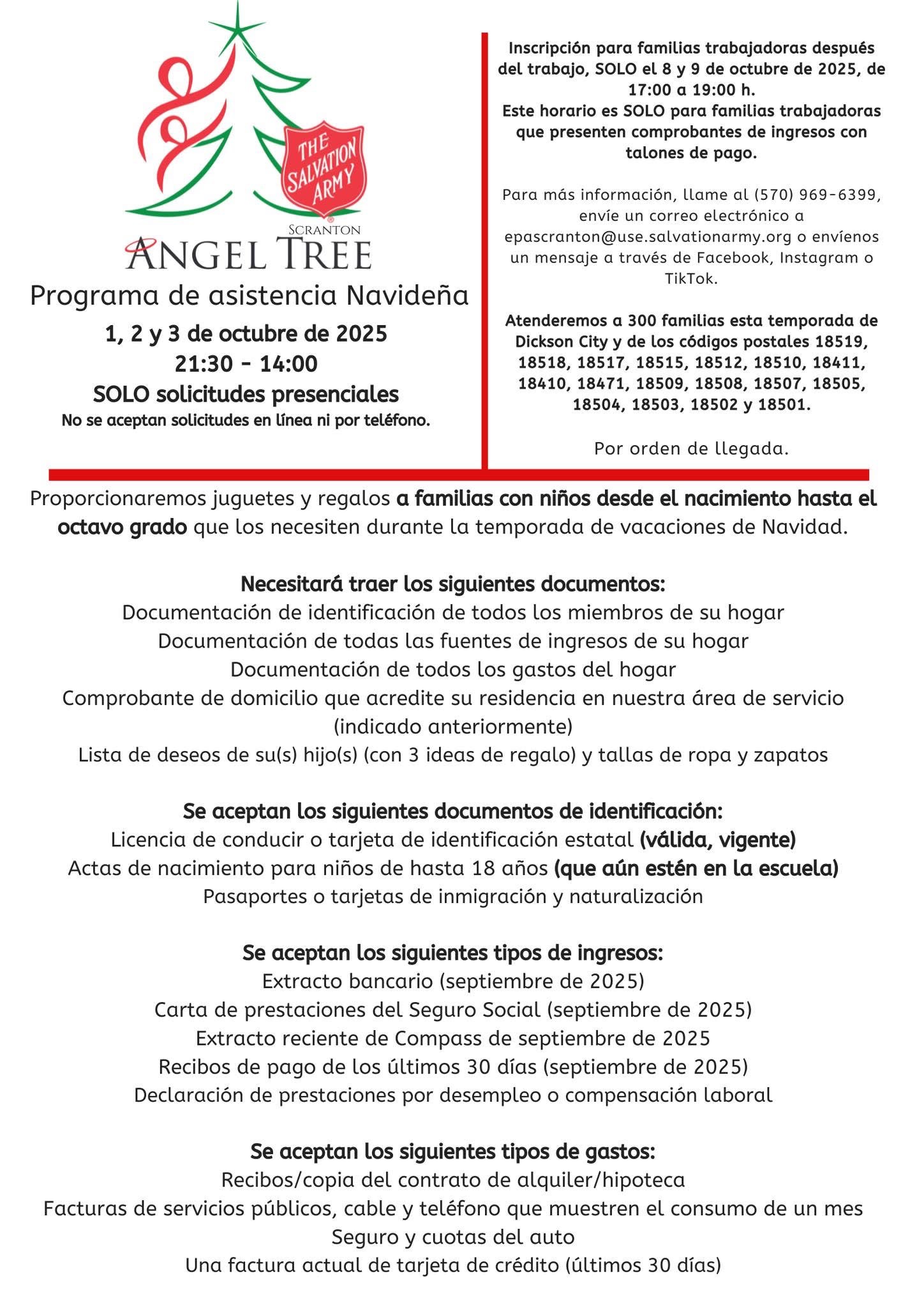 Las solicitudes para la asistencia navideña estarán abiertas del 1 al 3 de octubre, de 9:30 a. m. a 2:00 p. m. Si su familia trabaja y no puede asistir en los horarios mencionados, ofrecemos inscripciones exclusivas para familias trabajadoras los días 8 y 9 de octubre, de 5:00 p. m. a 7:00 p. m. Para inscribirse en este momento, es necesario presentar recibos de sueldo como comprobante de ingresos.