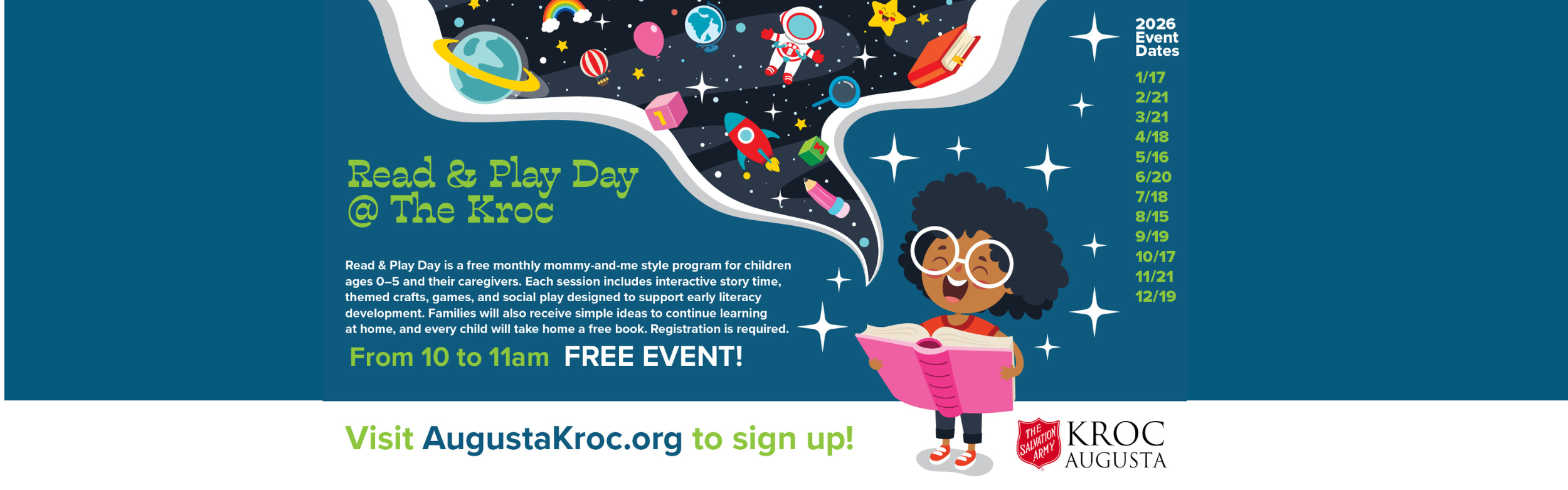 Read & Play Day is a free monthly early literacy program at the Kroc Center for children ages 0–5 and their caregivers, featuring interactive story time, crafts, games, and social play. Families receive simple at-home learning ideas and each child takes home a free book. Registration is required either at our front desk or online.