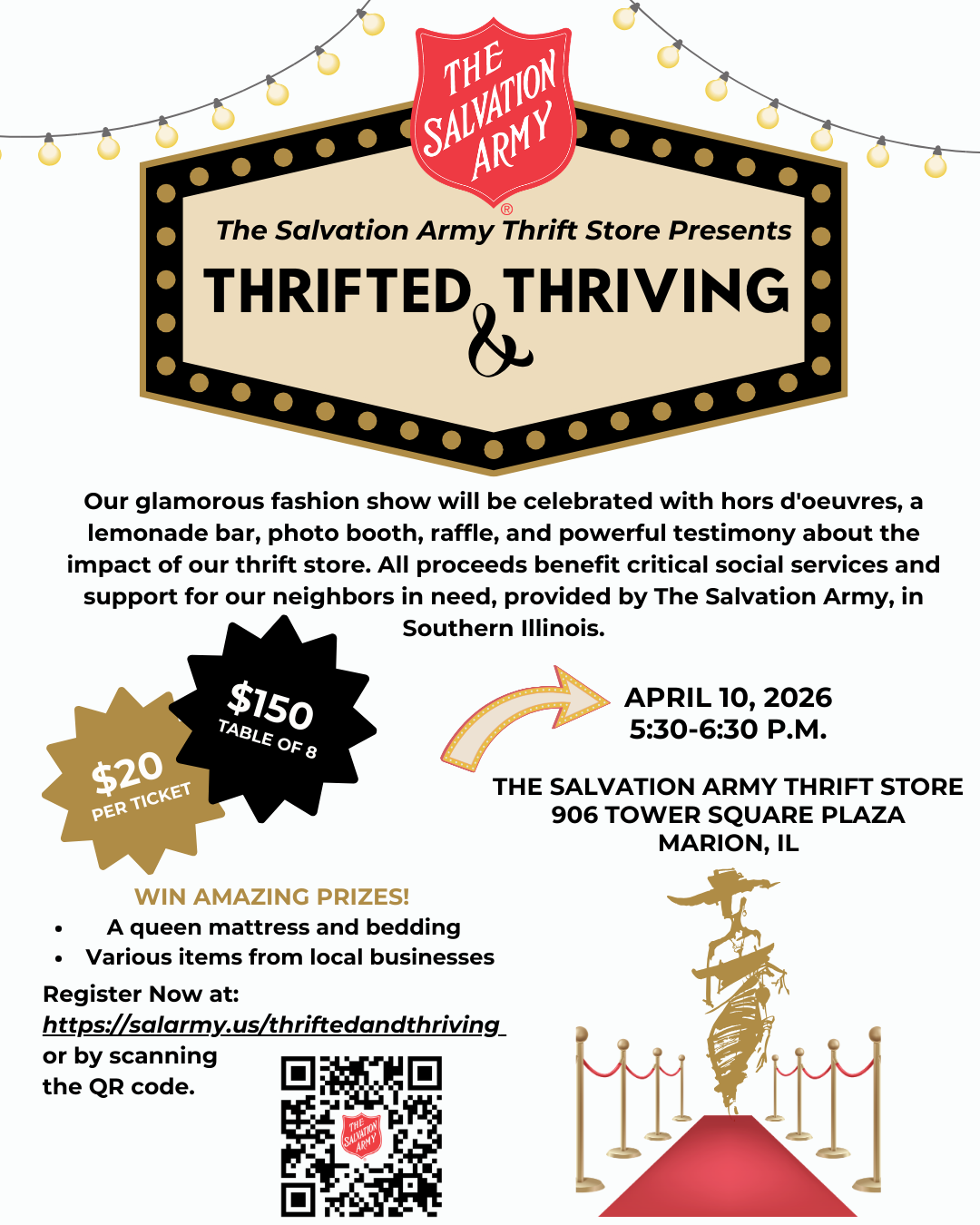 Our glamorous fashion show iwll be celebrated with hors d'oeuvres, a lemonade bar, photo booth, raffle, and a powerful testimony about the impact of our thrift store. All proceeds benefit critical social services and support for our neighbors in need, provided by The Salvation Army, in Southern Illinois.