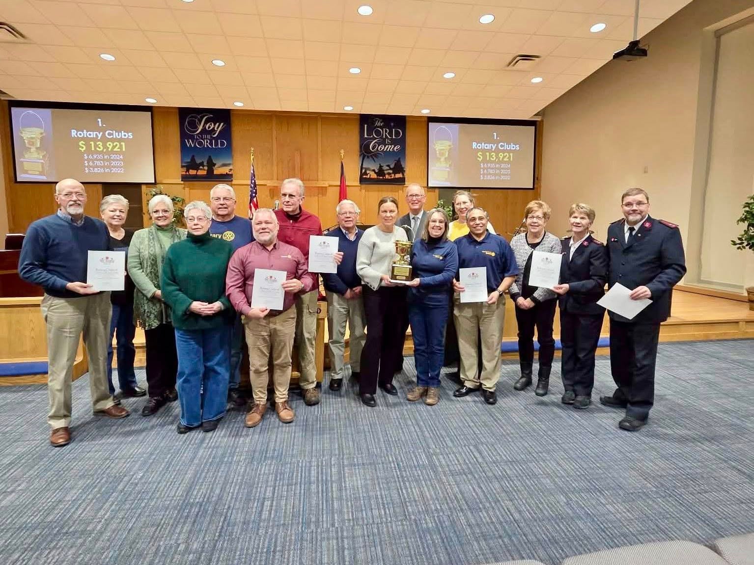 The coveted Golden Kettle, in recognition of the efforts of all service clubs, was awarded to the joint efforts of six Rotary Clubs of Calhoun and Barry Counties, who collectively raised $13,921.25 in the kettle campaign. Representatives from the Delton Area Rotary Club, Battle Creek Rotary Club, Marshall Rotary Club, Cereal City Sunrise Rotary Club, Albion Rotary Club, and Hastings Rotary Club were on hand to receive the trophy, which will be kept at each of the Rotary Clubs for two months and shared amongst the winners – just like the Stanley Cup! Previous winners have included the Masons of Ira A. Beck Lodge (2022), American Legion Post 257 (2023), and the American Legion Posts 257 & 298 (2024). The overall standings amongst Golden Kettle competitors are seen in the following table.