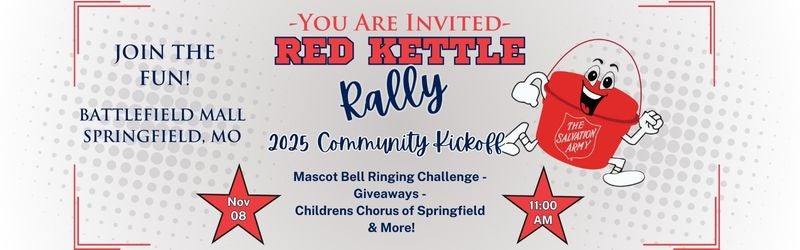 You are invited to the Red Kettle Rally-2025 Community Kickoff hosted by the Battlefield Mall! Enjoy a performance by the Springfield Children's Choir, a Mascot Bellringing Challenge, the Rogersville High School marching band, giveaways and more. We will announce our fundraising goal to meet the needs for the 2025 Christmas season and all throughout the coming year.