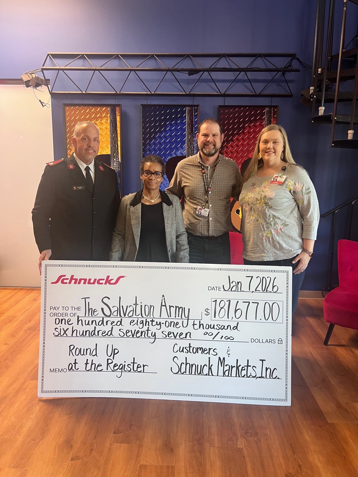 ST. LOUIS, Jan. 7, 2026 - Schnuck Markets, Inc. and The Salvation Army today announced that Schnucks customers and the company donated a total of $181,677 to The Salvation Army’s annual Red Kettle Campaign through the most recent Round Up at the Register. Schnucks customers had the option to round up their purchases to the nearest dollar, with 100% of donations from the 15-day campaign benefiting The Salvation Army. Customers donated $166,677, and Schnucks added an additional $15,000.