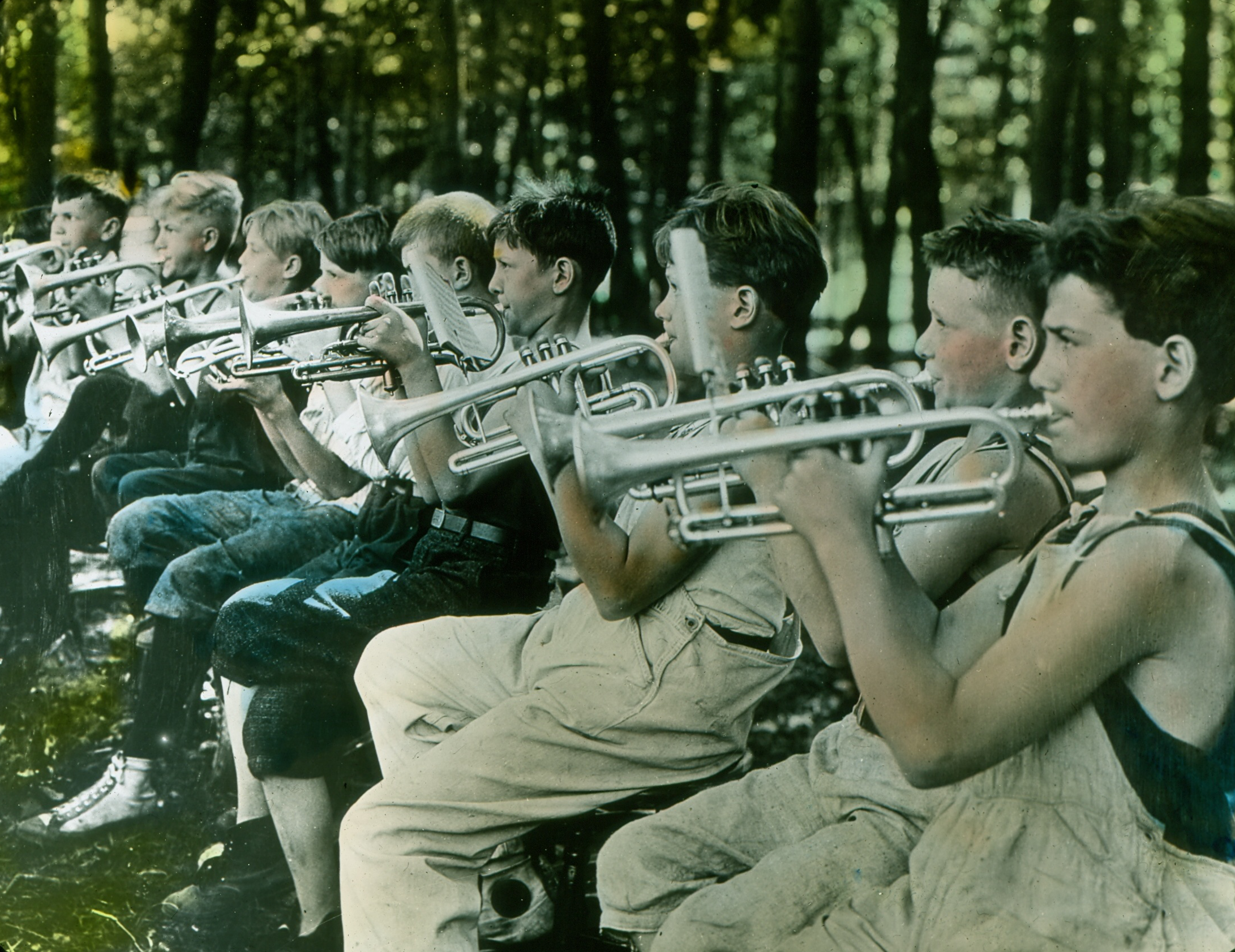 An old-time photo of kids from The Salvation Army's Music and Creative Arts program playing at Star Lake Camp.