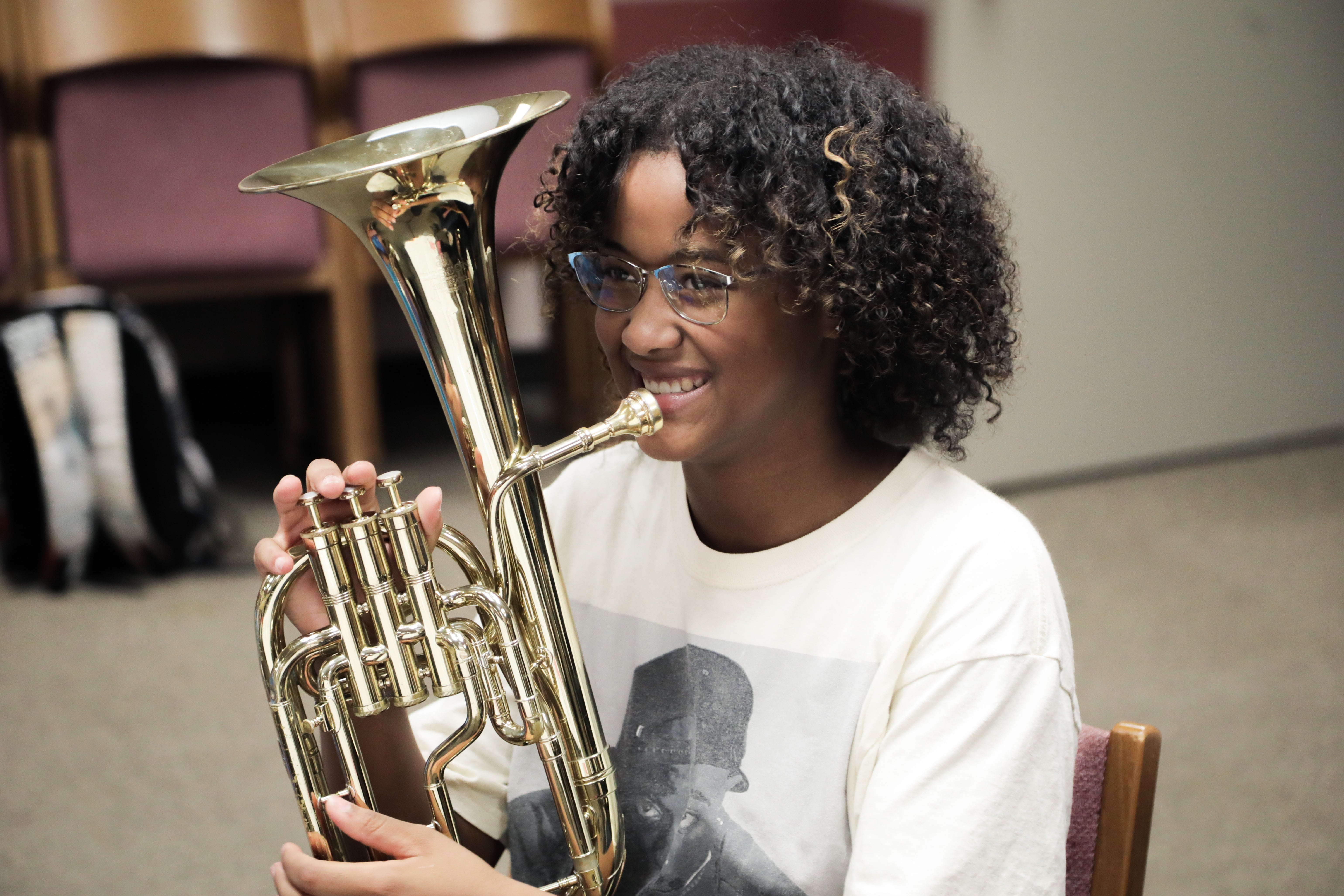 A student from one of The Salvation Army New York's music and creative arts program playing an instrument at one of our community centers.