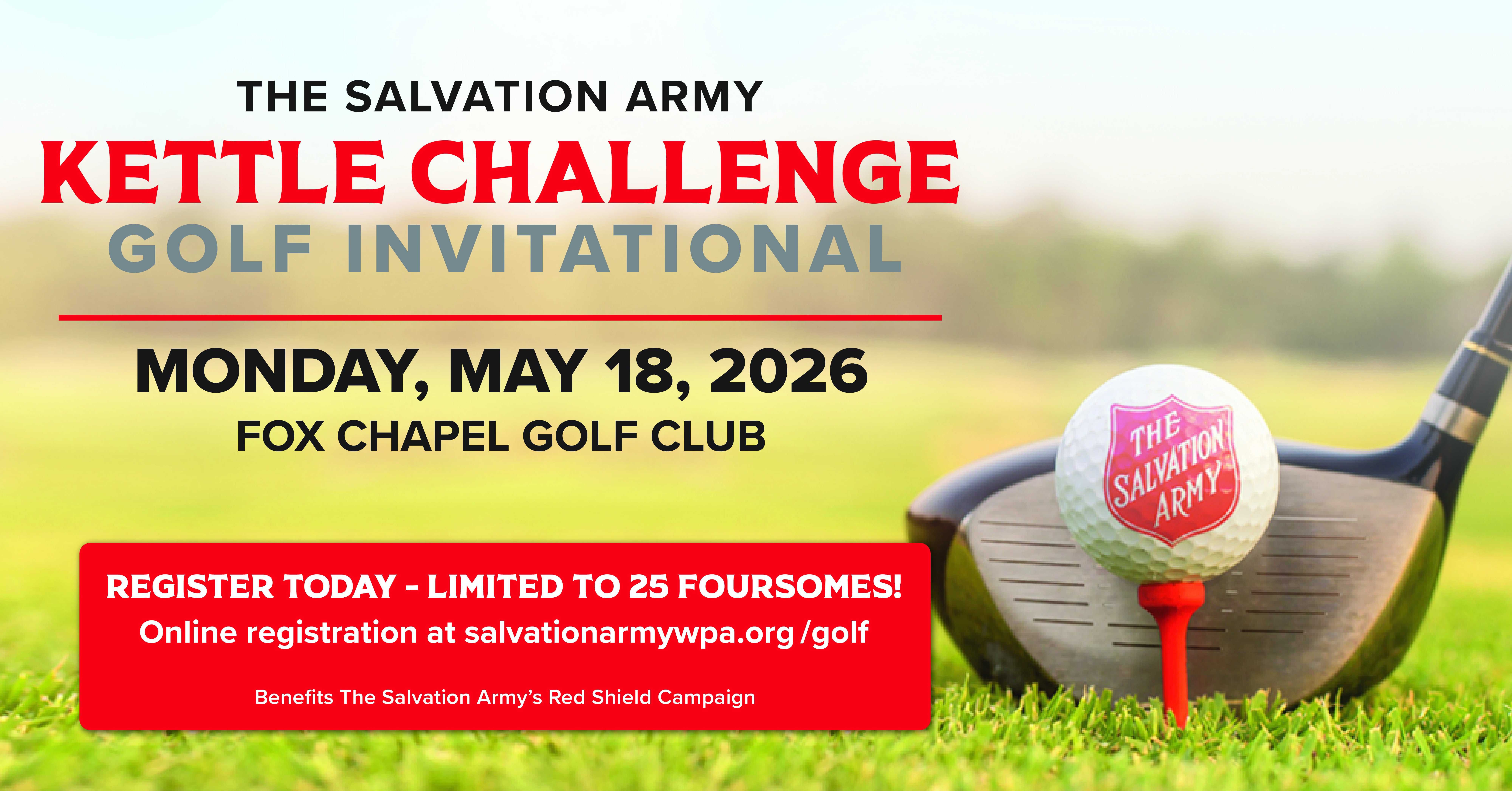 Join The Salvation Army for a day of golf at Fox Chapel Golf Club, which features a recently restored Seth Raynor course. Proceeds benefit The Salvation Army Red Shield Campaign which supports comprehensive social services, Emergency Disaster Services and The Salvation Army Family Caring Center. Registration and a light breakfast will begin at 9 a.m., there will be a shotgun start at 10 a.m. and a 19th hole reception and prize presentation will follow gameplay. Space is limited, visit salvationarmywpa.org/golf.
